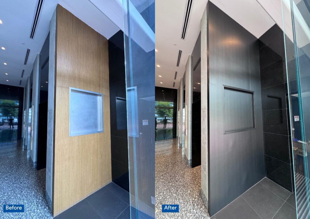 From outdated office spaces to scratched lift doors, 3M™ DI‑NOC vinyl wrap can refresh these areas and give them a new lease of life with minimal disruption to daily operations. The application requires little downtime, and provides existing structures a new look within a short timeframe.