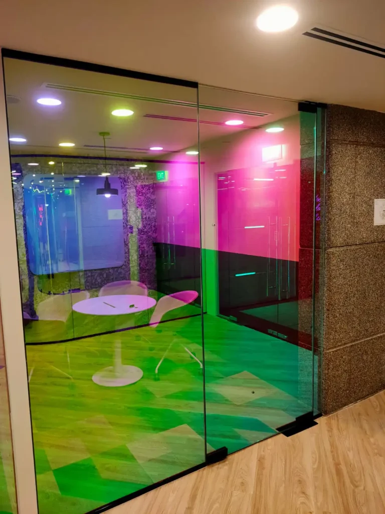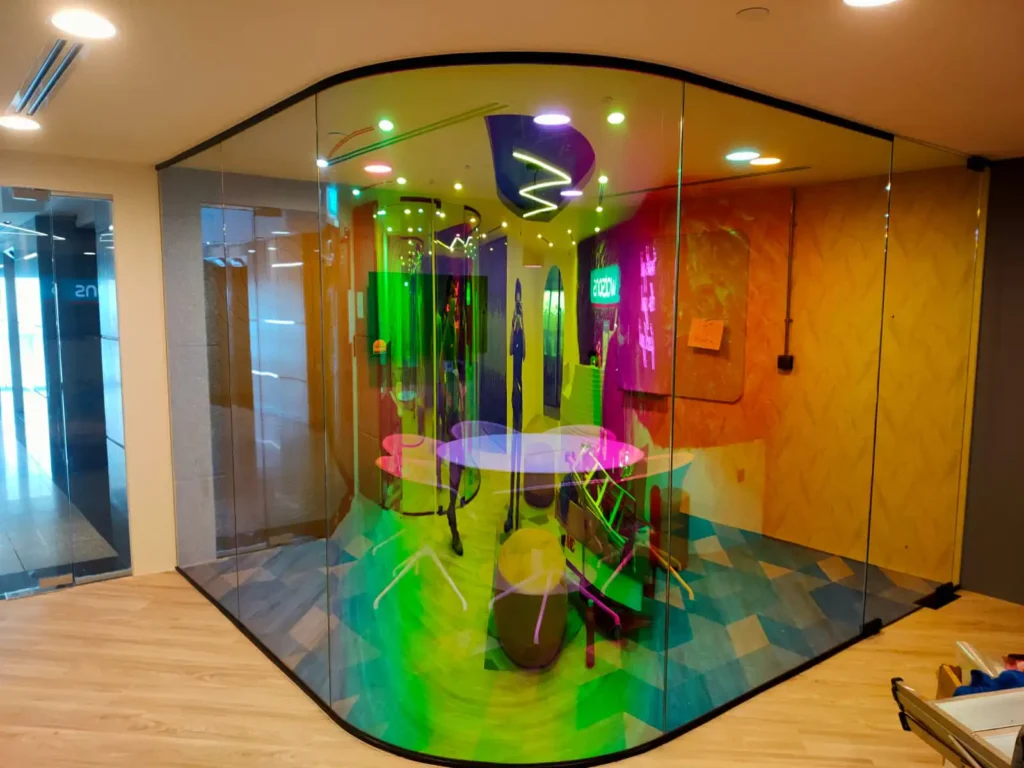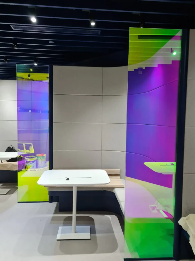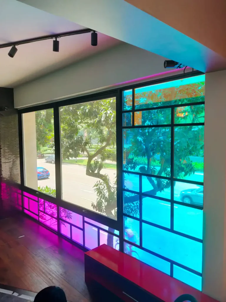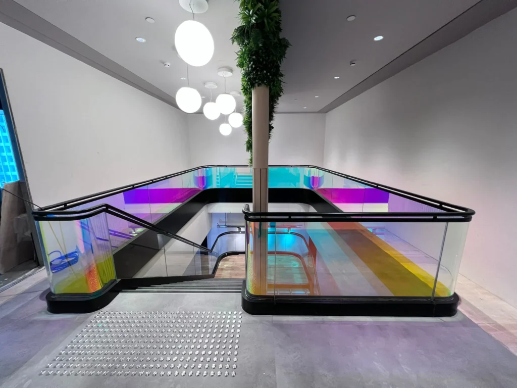 Add dynamic iridescence to your façade or interiors with 3M™ Dichroic Film — an eye-catching dichroic film that changes color based on light angle. Ideal for architectural highlights, this type of iridescent film replicates the shimmering, colour-shifting effect at a fraction of the cost of traditional glass installation methods. Combining light and aesthetics with innovative 3M technology, 3M™ Dichroic Film creates a dynamic, dramatic colour changing effect that makes your space stand out.