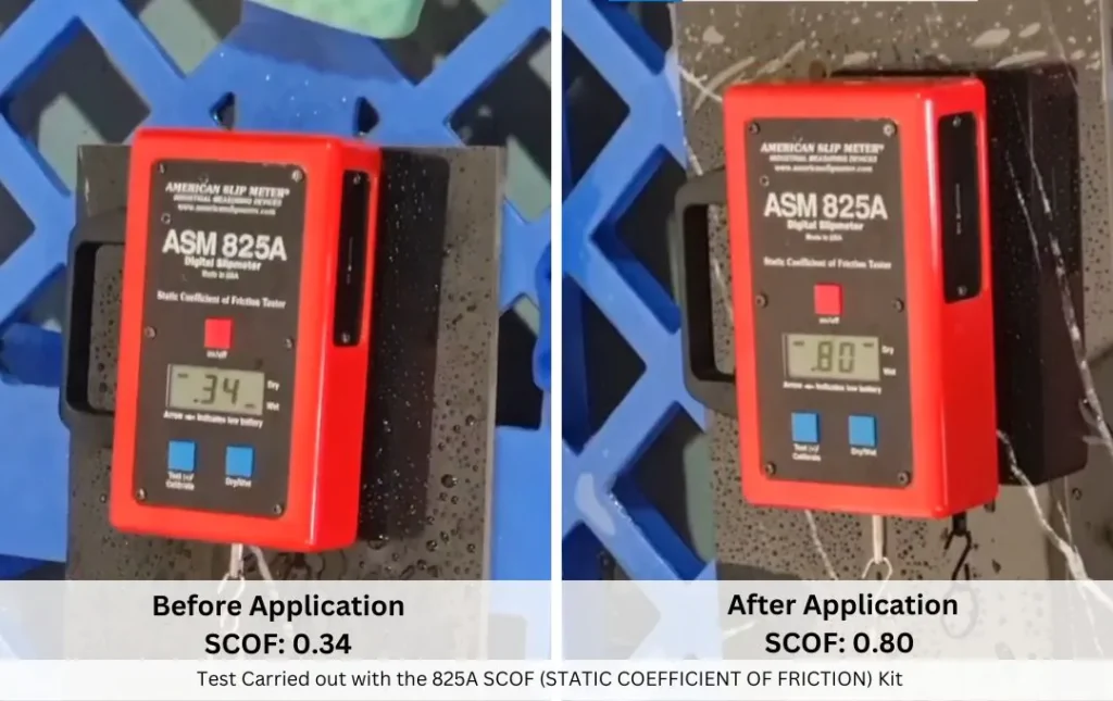 No Skidding Anti-Slip Floor Treatment has been tested and certified to meet the requirement of .60 Static Coefficient of Friction (SCOF).